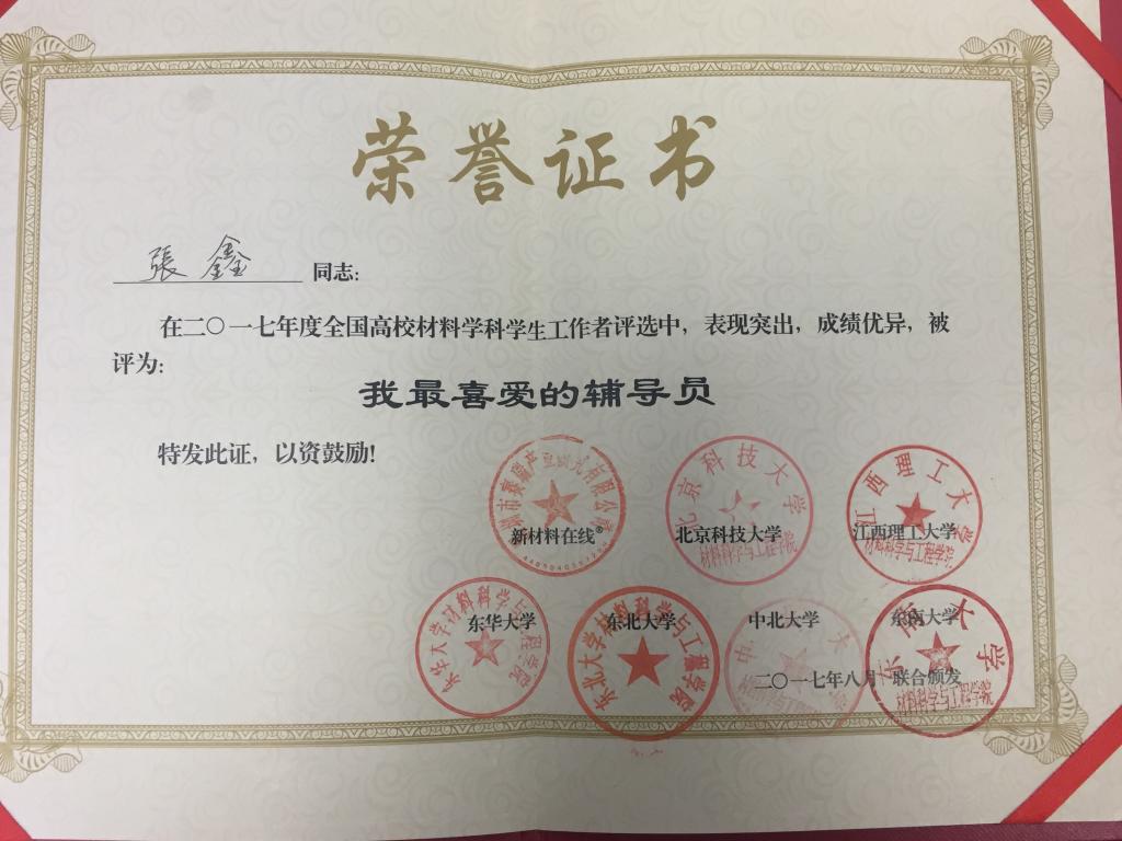 张鑫老师荣获2017年度全国高校材料学科“ 十佳学生工作者”。