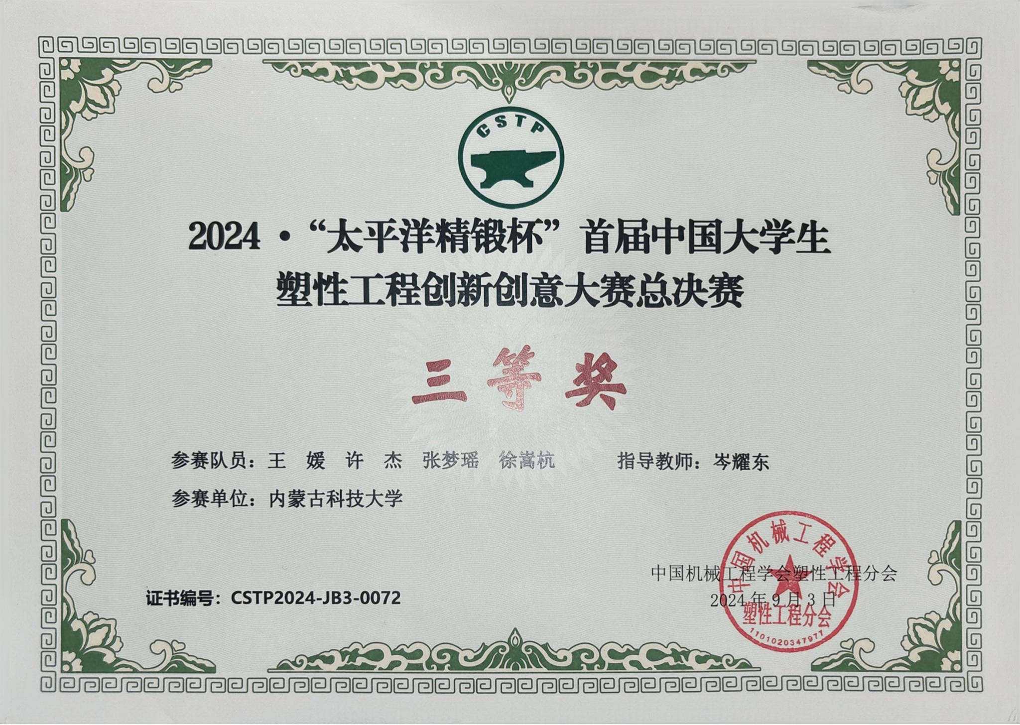 近日,由中国机械工程学会塑性工程分会主办、武汉理工大学和华中科技大学承办的首届中国大学生塑性工程创新创意大赛——“太平洋精锻杯”圆满落幕。由岑耀东副教授指导,王媛、许杰、张梦瑶、徐嵩杭申报的作品“双碳背景下的绿色环保新型高温拉伸夹具装置创意设计研究”获得本科生组全国三等奖。
