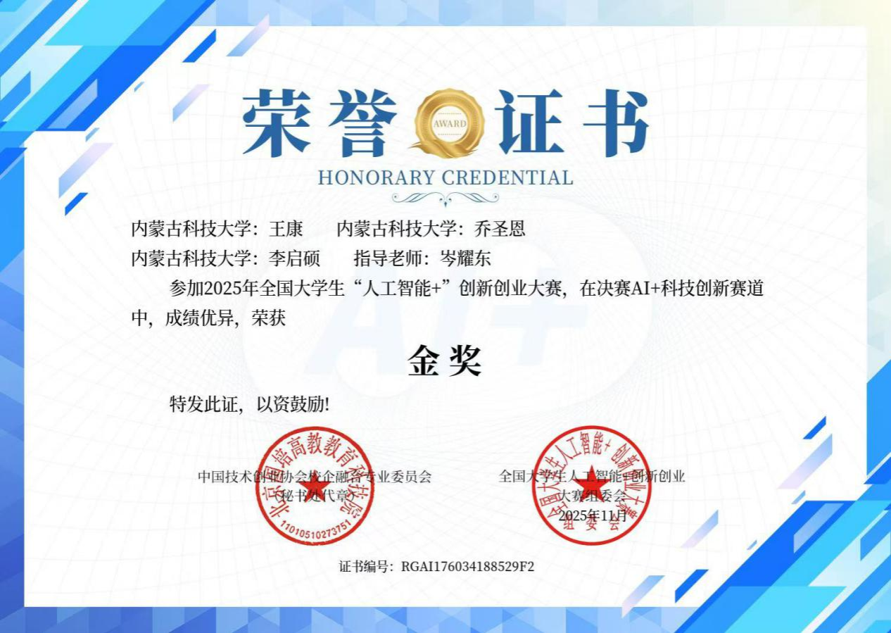 岑耀东副教授指导的1个研究生作品(队长为研2024刘建峰)和2个本科生作品(队长分别为成型2023-1王康、成型2023-2刘嘉豪),在2025年全国大学生“人工智能+”创新创业大赛中斩获金奖,为在线赌博APP