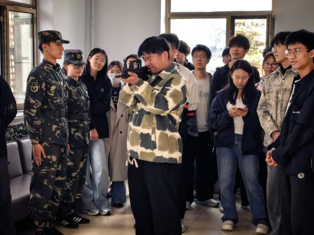 活动当天,在基地工作人员统一引导下,师生依次走进国防教育展厅、装备展示区,并集体观看了国防教育宣传片。国旗护卫队队员首先介绍了队伍发展历程与所获荣誉,并结合国旗知识、护卫职责等内容开展现场讲解,引导师生深刻理解国旗尊严与家国情怀。随后,砺剑社团成员借助装备模型,系统讲解了我国现代军事科技成果及相关军事常识,内容翔实、通俗易懂。蓝天救援队队员则围绕应急救援、安全防护、避险自救等知识开展科普宣讲,进一步增强了师生的安全防范与应急处置能力。