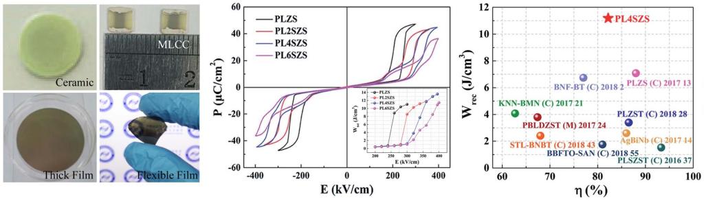 电介质电容器在电力电子、脉冲器件及微电子领域有着极为广泛的需求和应用,而高储能密度介电新材料的开发是推动相关器件向前发展的关键。实验室先后对反铁电材料及弛豫性铁电材料的结构设计及储能行为进行了深入研究,并提出了多尺度结构设计理念及方法,实现了对这些材料的储能行为的优化,得到高储能密度、低损耗、高耐疲劳及温度稳定性良好的块体陶瓷、厚膜、薄膜及多层陶瓷电容器材料。研究成果在本领域期刊Journal of Materials Chemistry A、Journal of Materials Chemistry C、Acta Materialia、Applied Physics Letters及Journal of the American Ceramic Society等获得报道,申请中国发明专利10余项。研究工作引起了国内外同行的关注,团队成员多次应邀在相关学术会议上做主题发言报告。研究成果处于国际领先水平,对高功率密度大容量固态电容器的开发具有重要的指导意义。